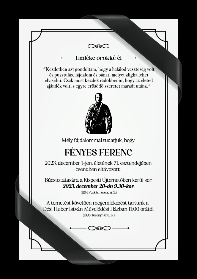 Életének hetvenegyedik esztendejében elhunyt Fényes Ferenc harmadik danos judomester, edző. Búcsúztatására 2023. december 20-án szerdán 9:30 órakor, a Kispesti Újtemetőben (Budapest XIX. Puskás Ferenc utca 3.) kerül sor.