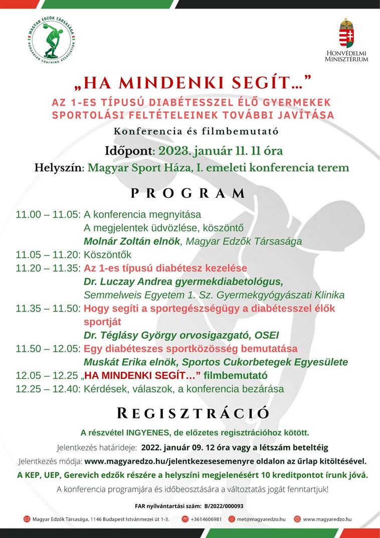 A Magyar Edzők Társasága a Honvédelmi Minisztérium sportért felelős államtitkársága támogatásával elkészítette a „Ha mindenki segít….” című ismeretterjesztő-oktató rövidfilmet, amely azt 1-es típusú diabétesszel élő gyermekek sportolási lehetőségeinek támogatásáról szól. A rövidfilm nyilvános bemutatója 2023. január 11-én, a Gyermekdiabétesz Napján lesz a Magyar Sport Háza I. emeleti konferenciatermében.