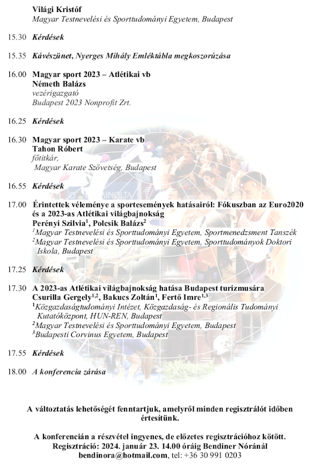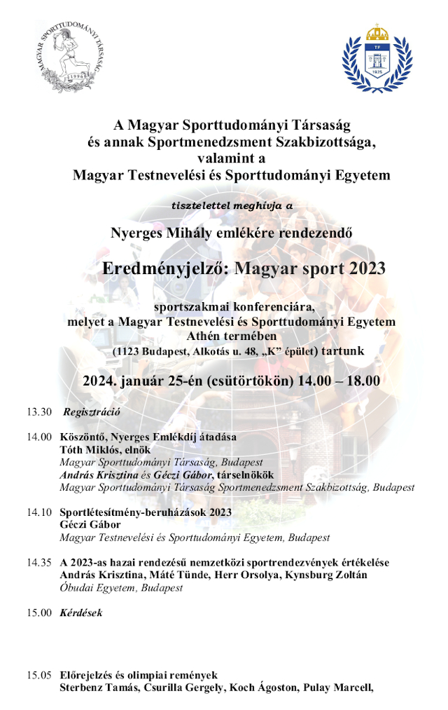 A Magyar Sporttudományi Társaság és annak Sportmenedzsment Szakbizottsága, valamint a Magyar Testnevelési és Sporttudományi Egyetem tisztelettel meghívja a Nyerges Mihály emlékére rendezendő Eredményjelző: Magyar sport 2023 sportszakmai konferenciára.
