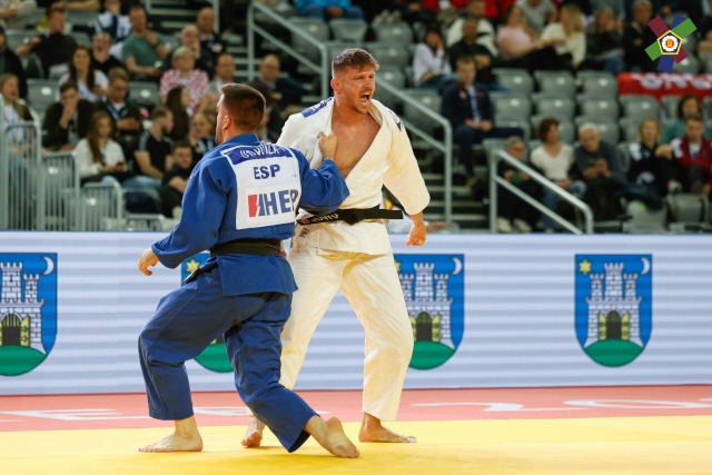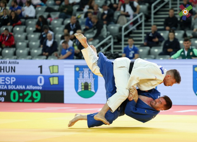 A legjobb nyolc közé jutásért a spanyol Alfonso Urquiza következett, aki egyszer már – éppen itt, Zágrábban, a 2022-es Grand Prix-n – borsot tört Ungvári Attila orra alá. A meccs első fele ezúttal is a spanyolnak kedvezett, a budaörsi judós két intést is kapott, de ezt követően nagy fordulatot vett a párharc, előbb a magyar kapott vazarit gyors akciójára, majd Urquiza is megkapta a második intését. Valójában kilépésért már a harmadikat is meg kellett volna kapnia, de Ungvári Attilát ez sem ingatta meg, egy szép kontrából ippongyőzelmet szerzett.